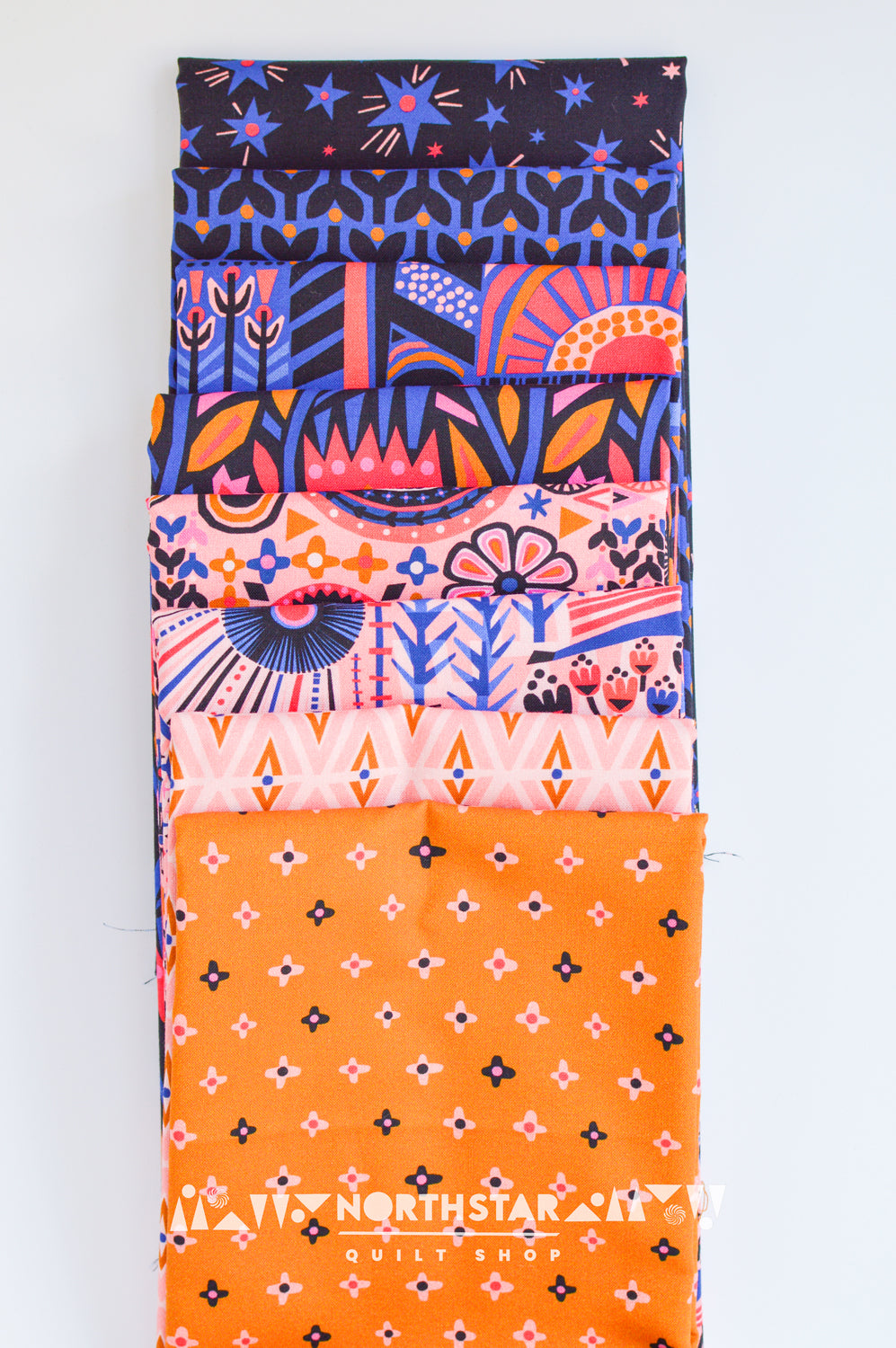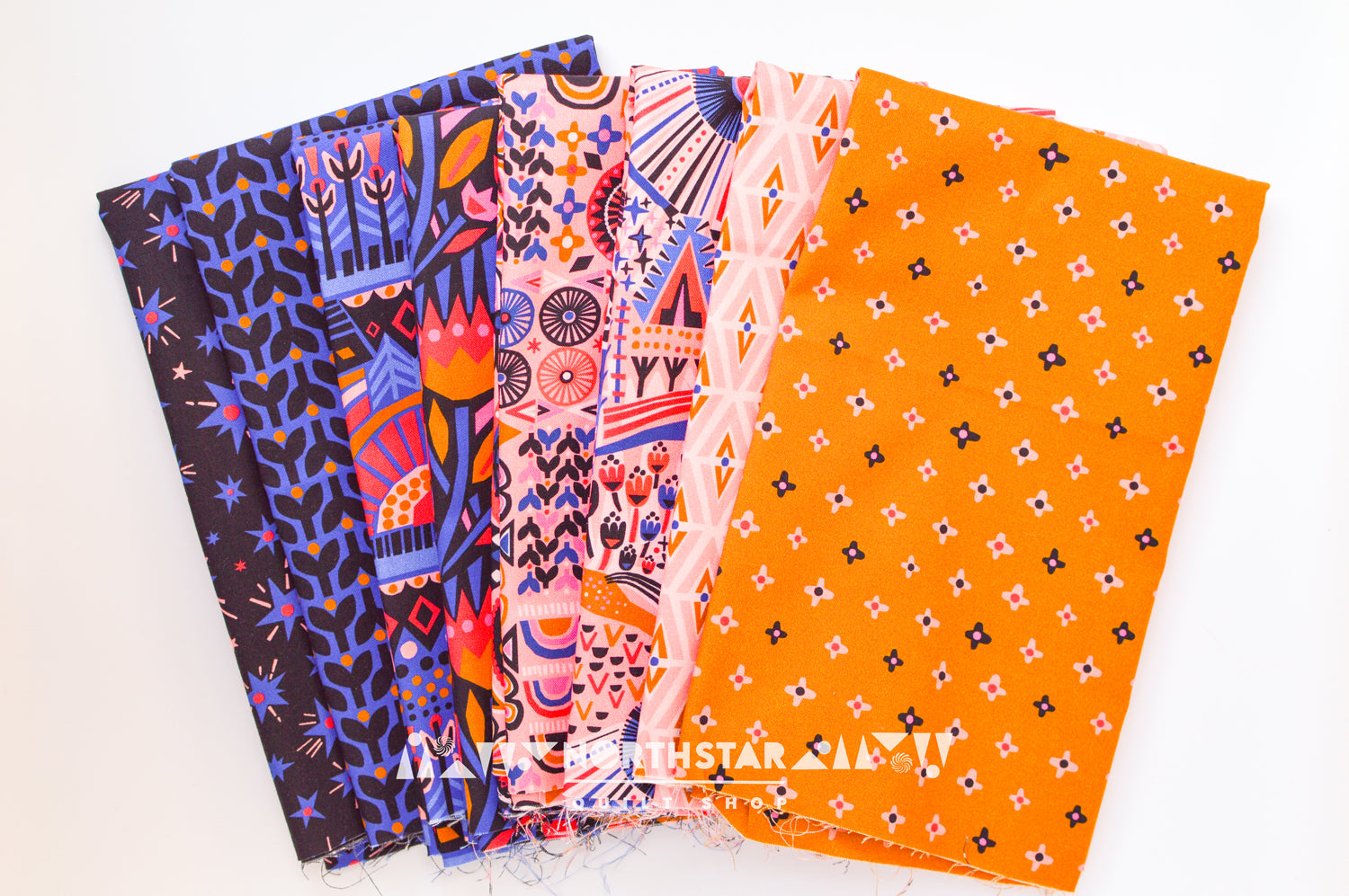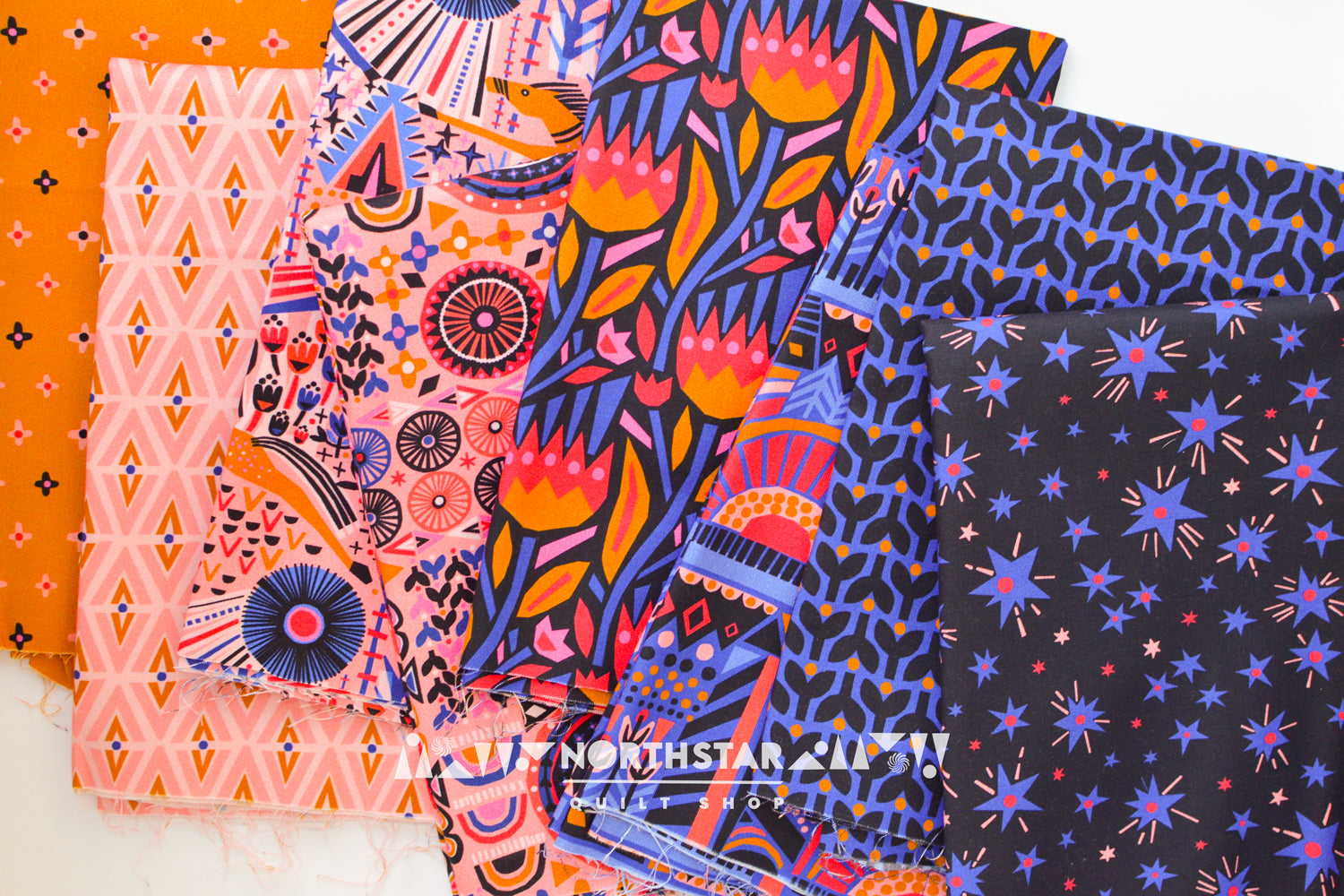 Modern Novelty: quilting cottons bursting with an array of bright pinks, bold blues, and warm ochres inspired by myths, legends, and folk songs.